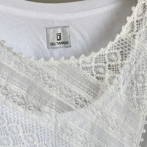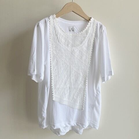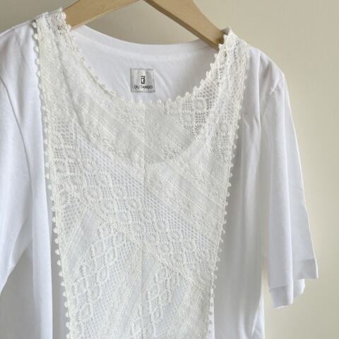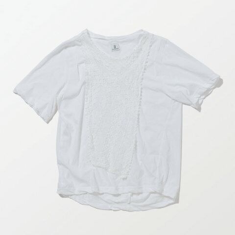 カリフォルニアのサーホンキーバレーの雪解け水で育った原綿を使用した、独特のシャリ感と柔らかさのある天竺をボディーに使い、4種のコットンレースをはぎ合わせたパーツを大胆にフロントにトッピングさせたラグジュアリー感のあるカットソー。インナーにして襟元をのぞかせたり、夏のミニマムスタイルのアクセントとしても便利なアイテム。