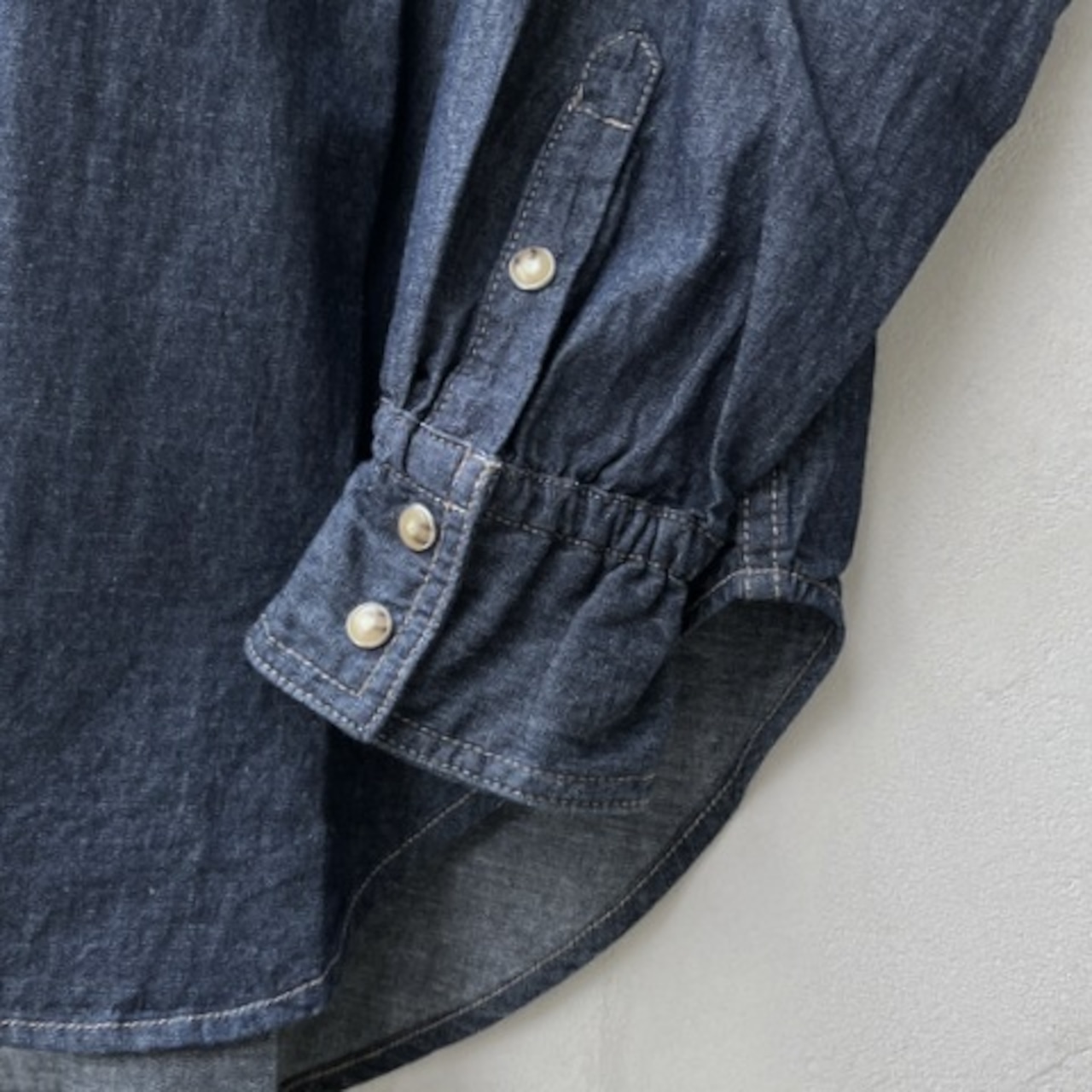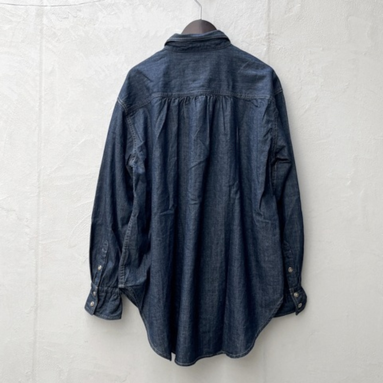 5.5 oz、タテヨコにスラブ入りのダンガリー。前シーズンよりも少し生地を薄くしてさらに着やすくなりました。製品でストーンブリーチ加工をしたオーバーサイズのレギュラーカラーシャツ。 襟端にワイヤーが入っており雰囲気よく形を作れます。 袖口カフスにはゴム入り、背ヨーク下にギャザーをたっぷり施しています。