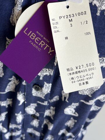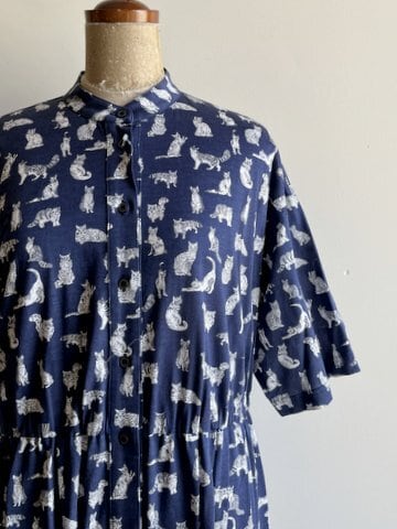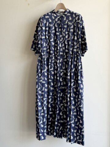 Parkes(パークス)リバティプリント <Meow>(ミャオウ)【ネイビー】ウエストシャーリング 5分袖 ブラウジング ワンピース PY2531002