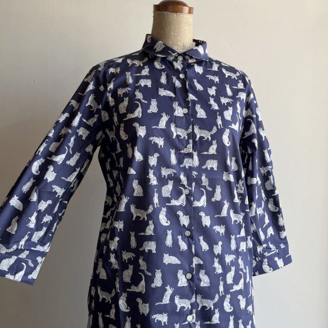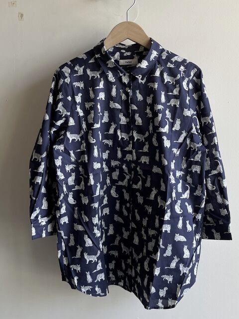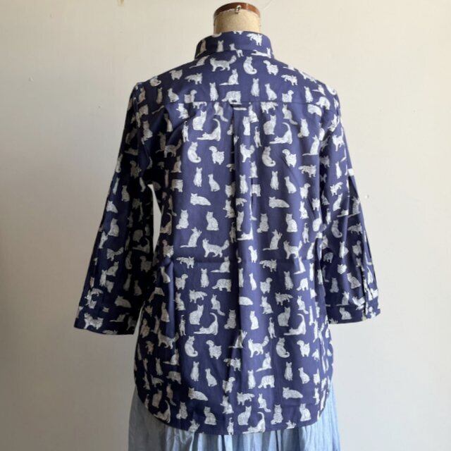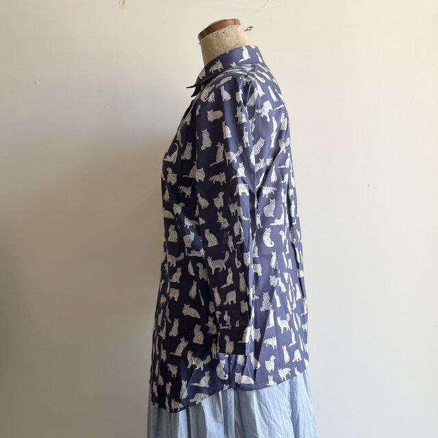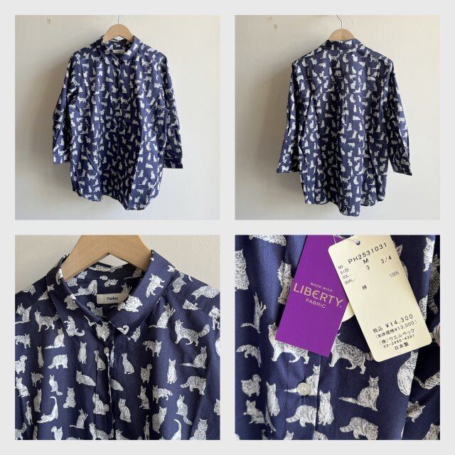 リバティプリントの<Meow>(ミャオウ)の新バージョンを使ったシャツブラウスです。