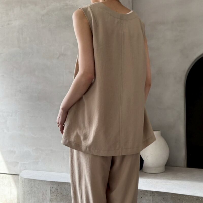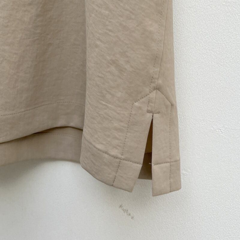 シワになりづらく、お手入れも簡単◎同素材のパンツとセットアップにすれば、リラックス感と上品さを両立した大人の装いに