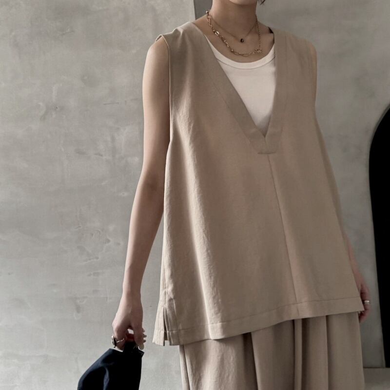 抜け感Vネックベストで、レイヤードをアップデート