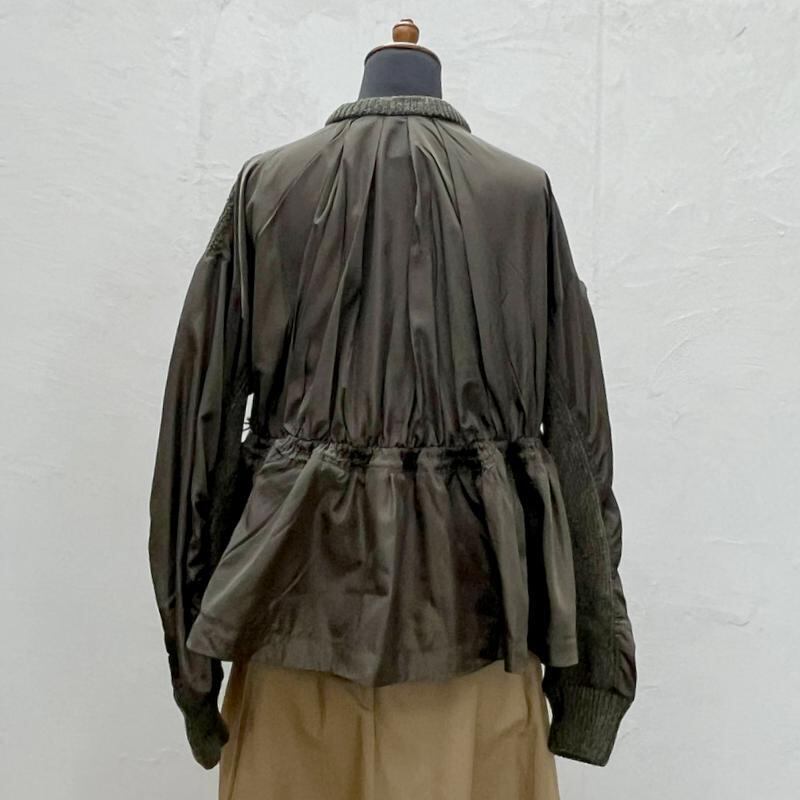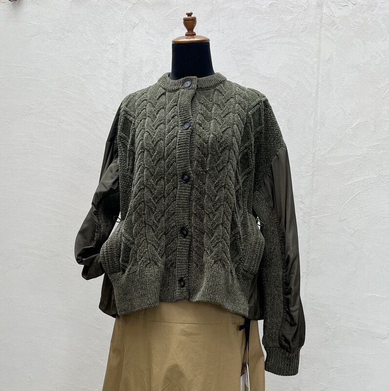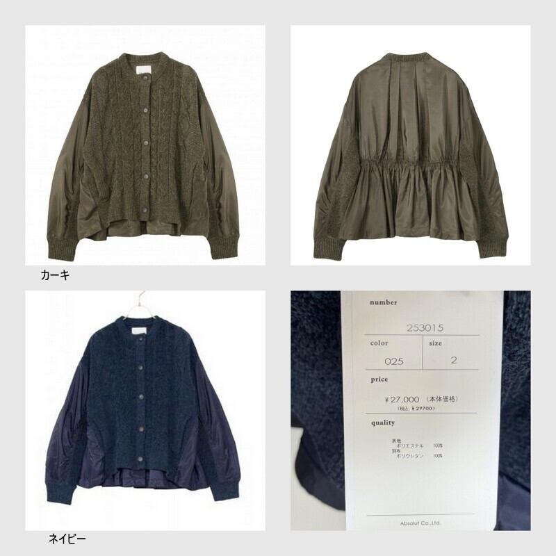 フロントはモール糸を使ったふわっと柔らかなケーブルニット、後ろと袖は光沢感のあるブルゾン素材。