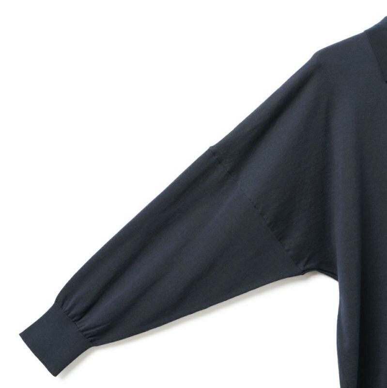 ドロップショルダーのゆったりとしたシルエットが、体のラインを拾わず自然に体型カバー。
