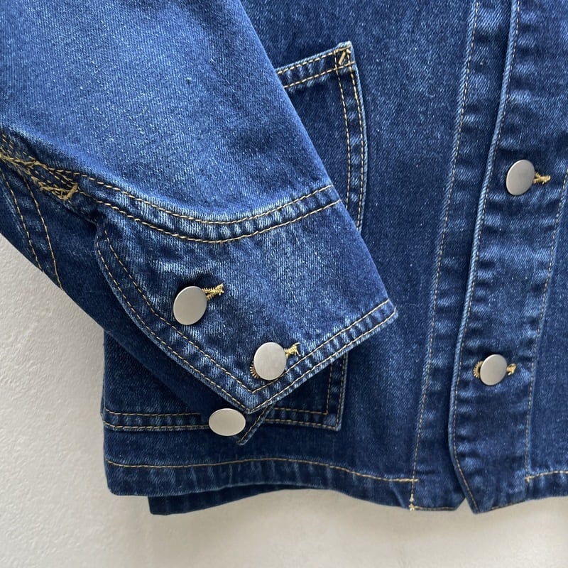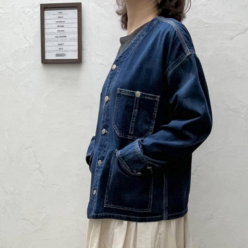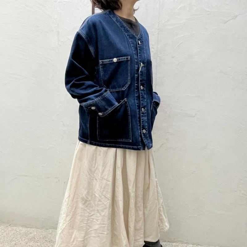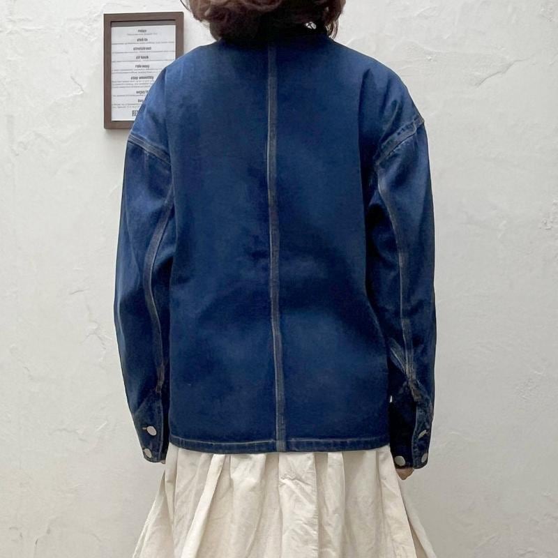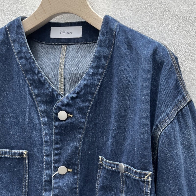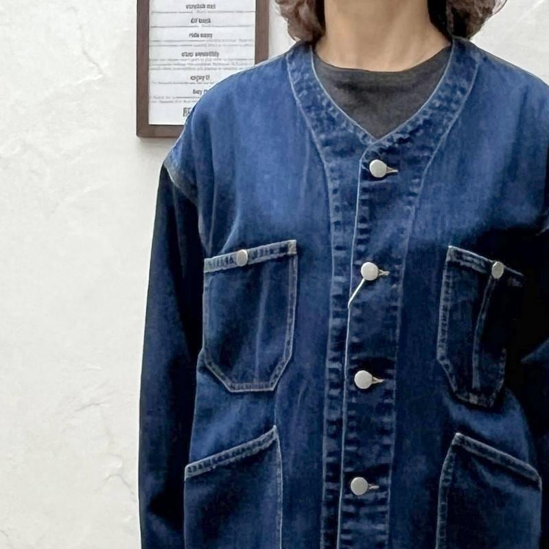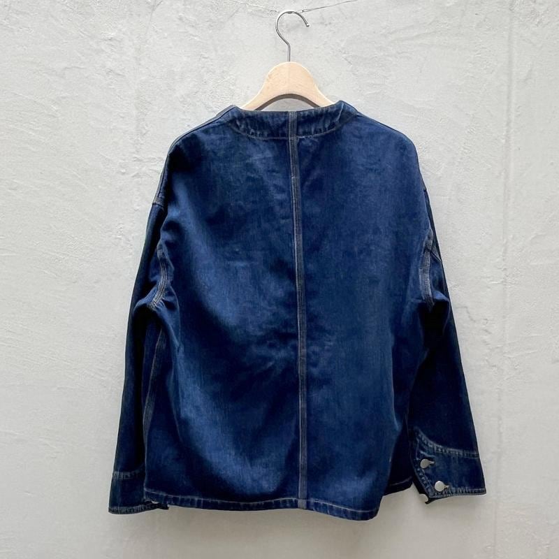 ノーカラーデザインがデニム特有のワーク感を和らげ、クリーンで洗練された印象に。着込むほどに味わいを増し、デイリーに長く楽しめる1着です。