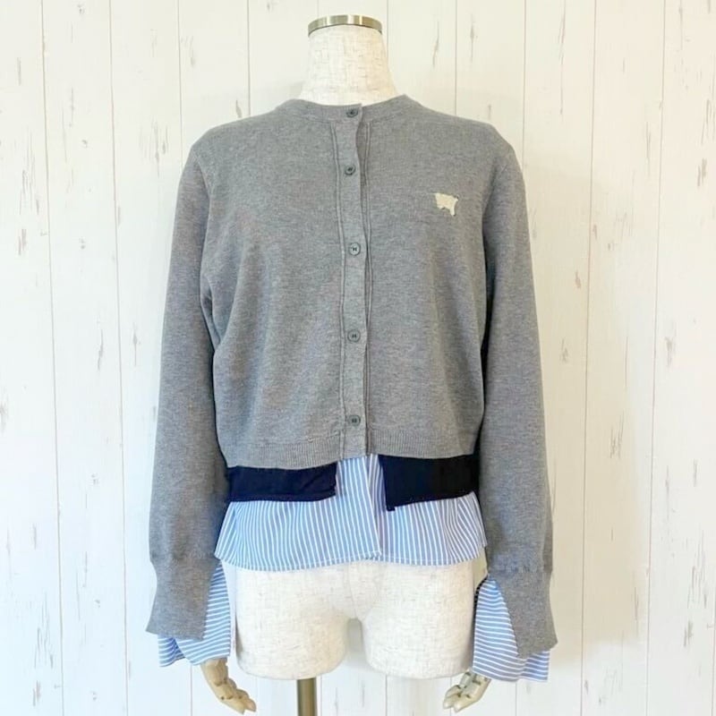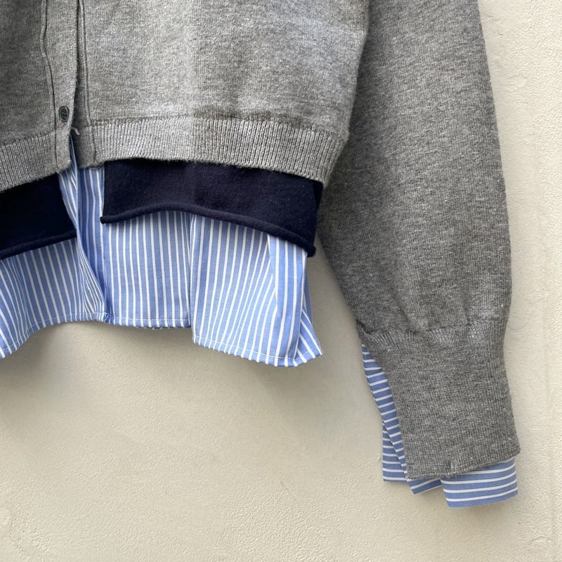 シャツを重ねているように見える、フェイクレイヤードデザインのカーディガン。