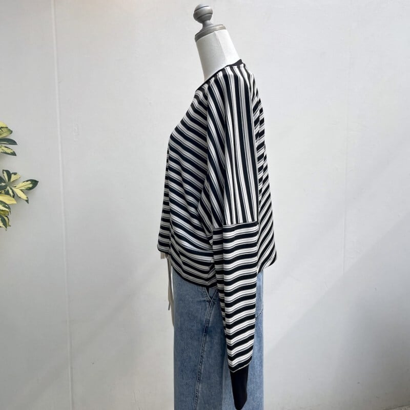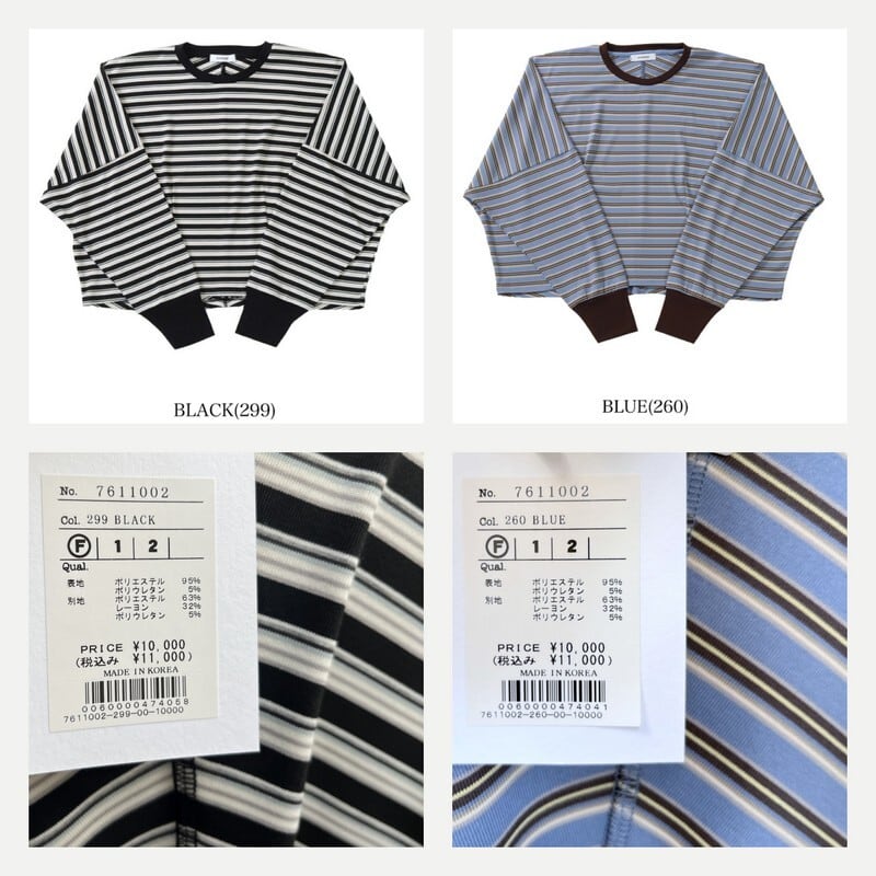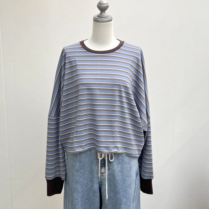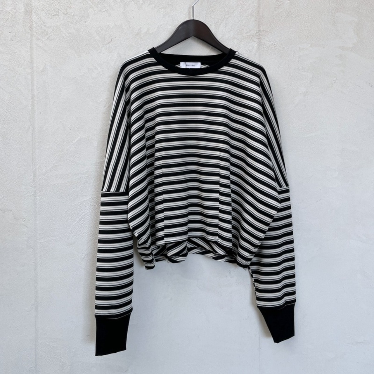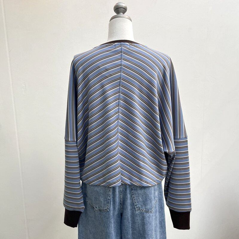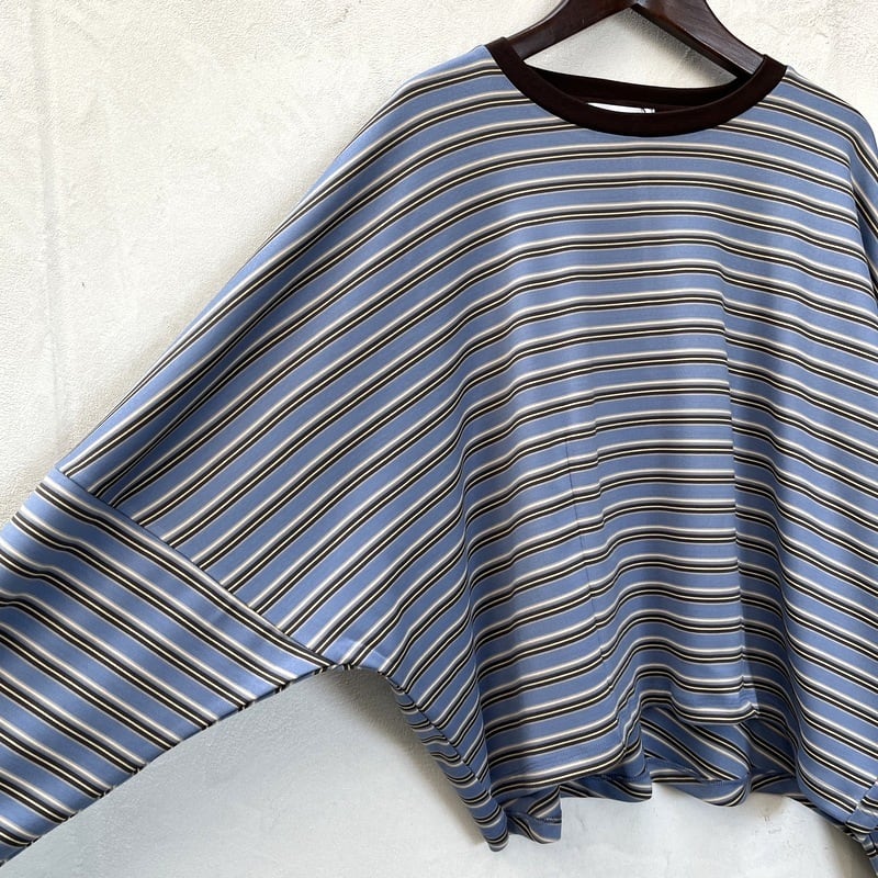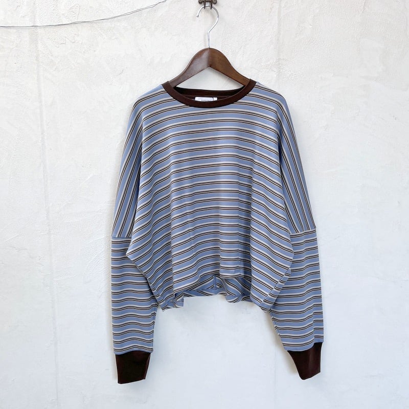 とろみのある柔らかなフライスマルチボーダーで、ネックと袖口は無地切替えになっています。