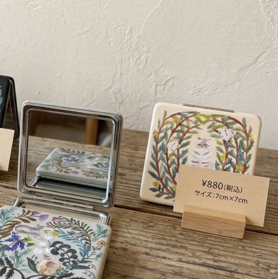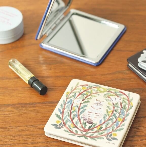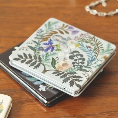 植物と動物たちが寄り添う、切り絵デザインが印象的なコンパクトミラー。 松尾ミユキさんの世界観がぎゅっと詰まっています。
