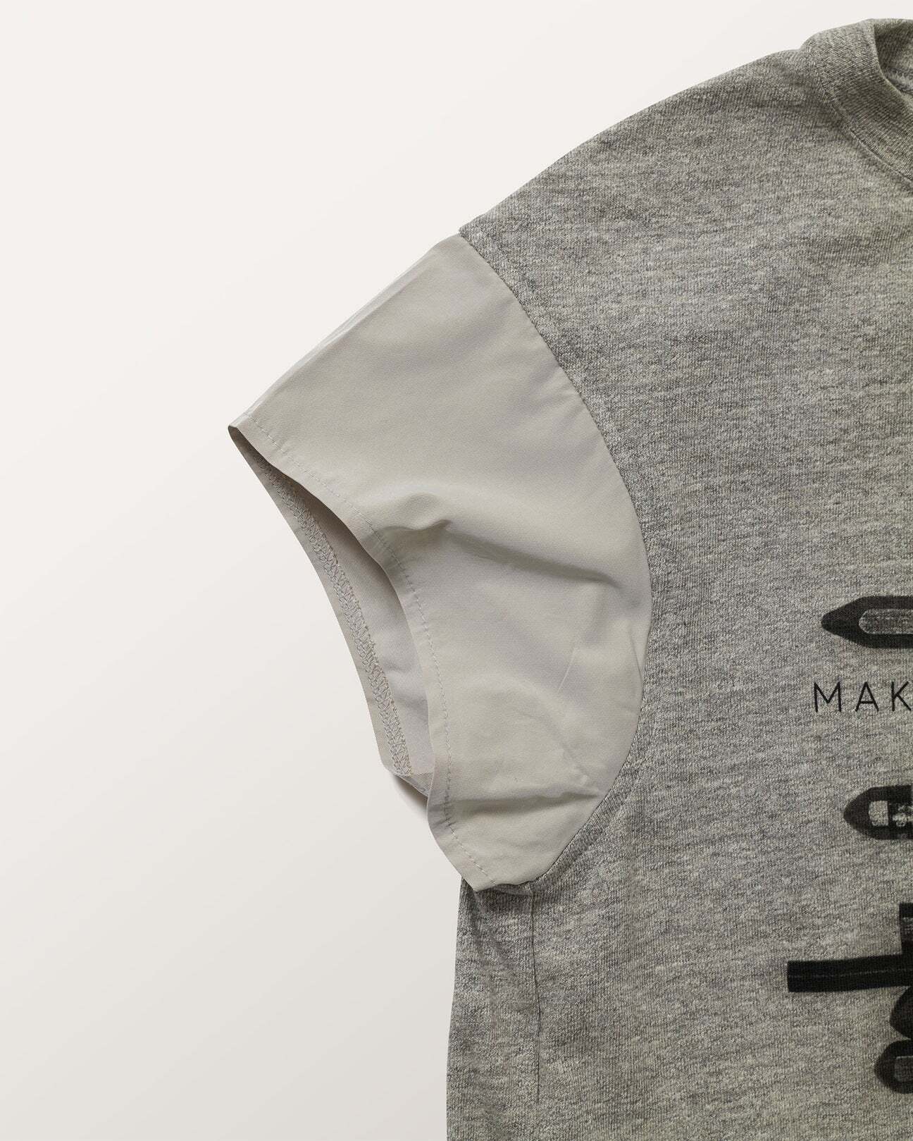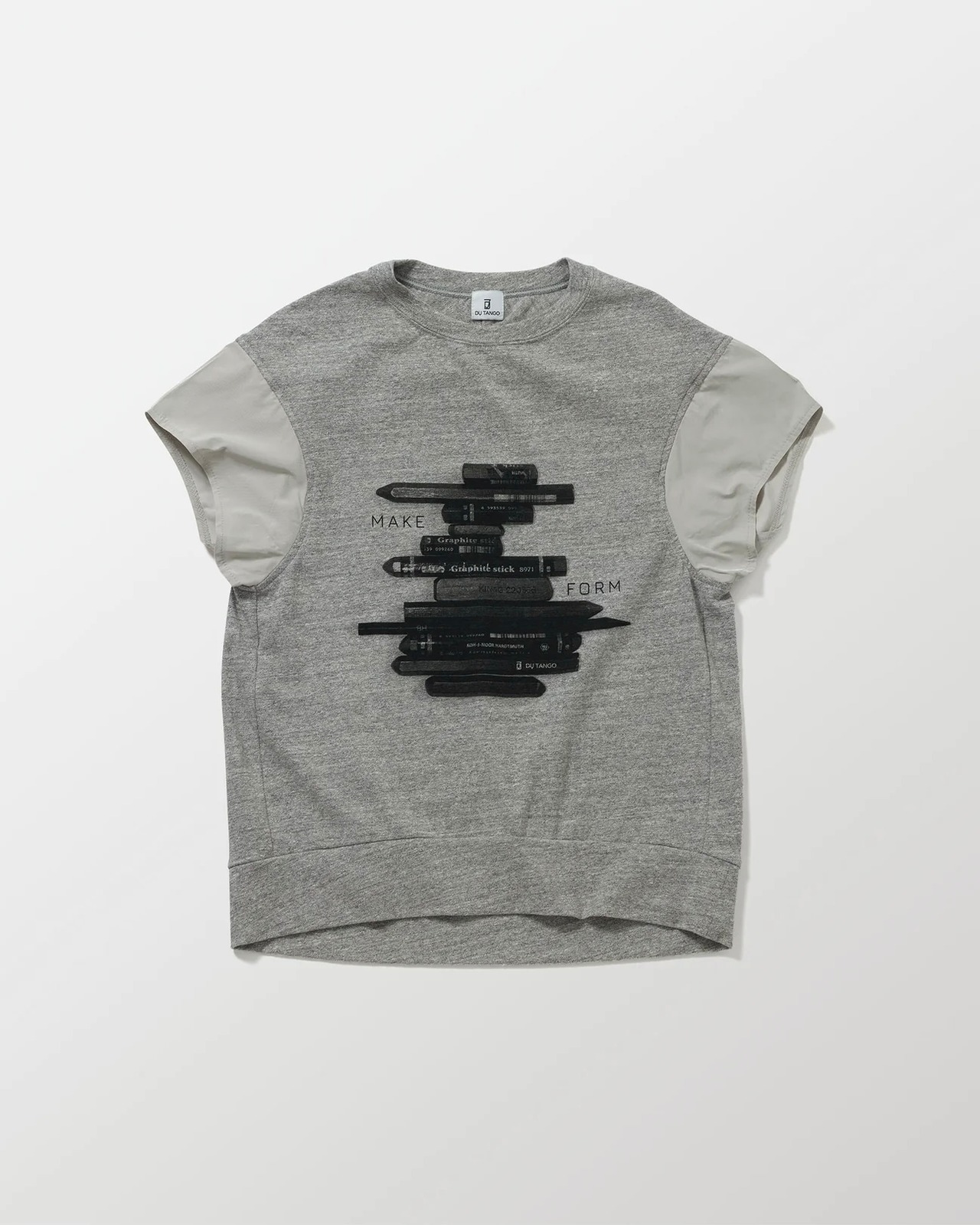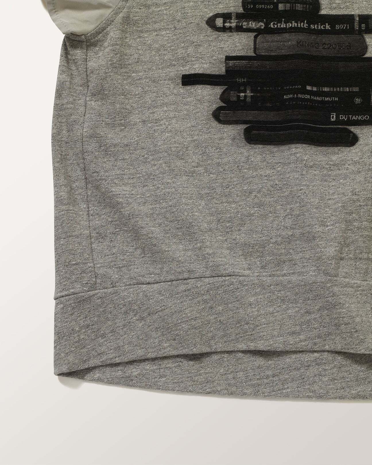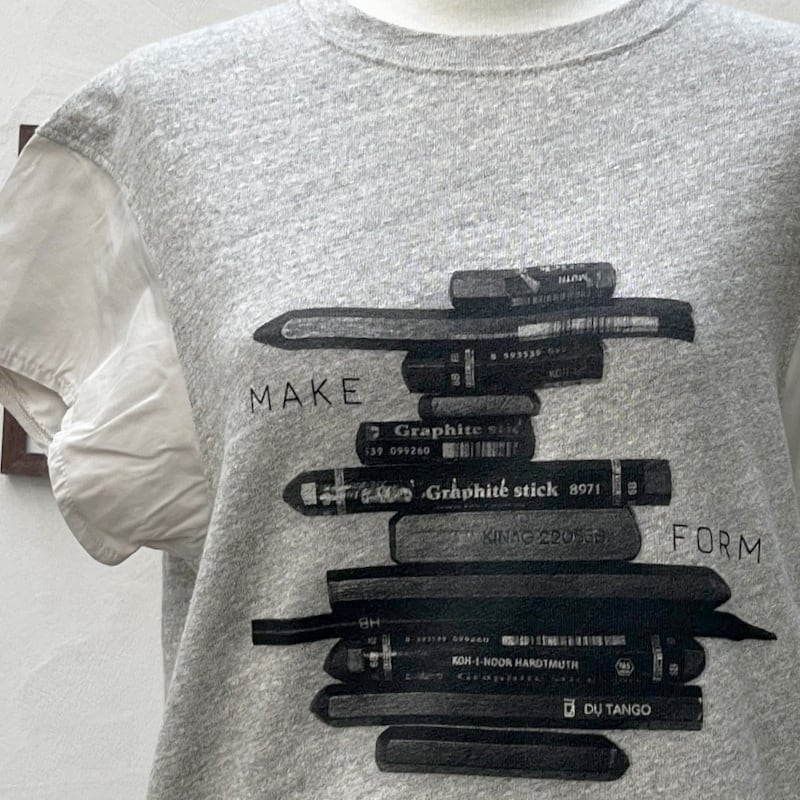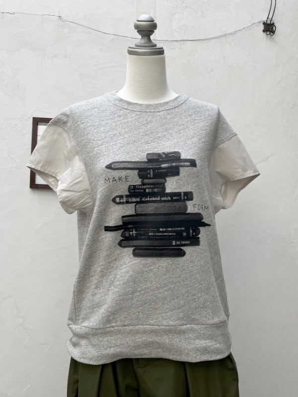 もちもちした柔らかさとストレッチ性を併せ持つロボスニットをボディにメモリータフタを袖に使用したグラフィカルTEE。深いアーム下のカバーとして、薄天竺の脇あても付けました。クロッキーデッサン用のペンをモチーフにしたプリントはコレクションテーマであるアーティストにフォーカスしたデザイン。