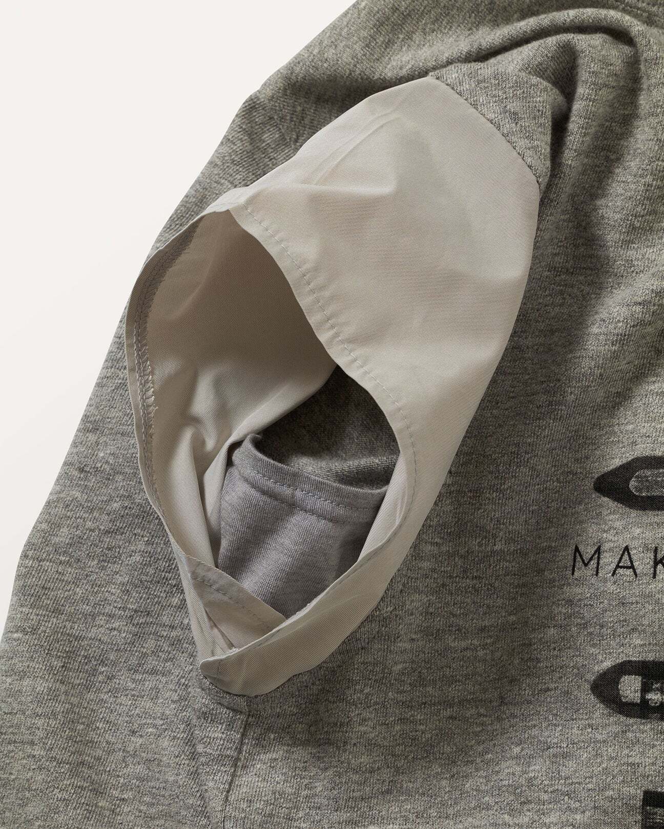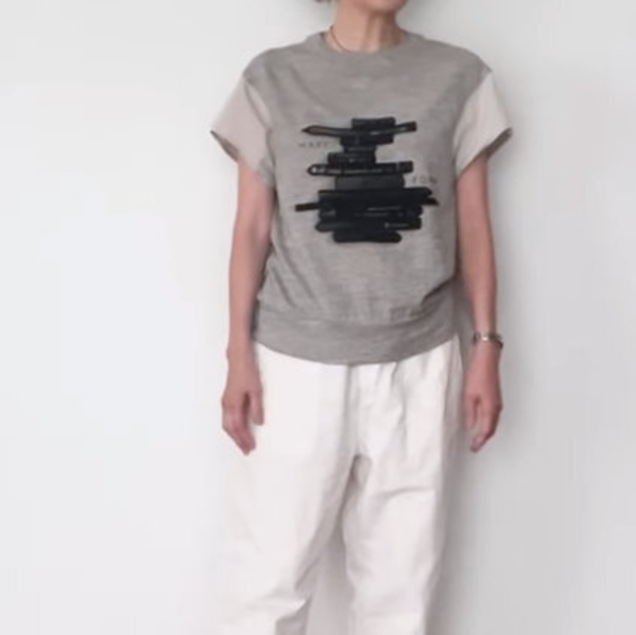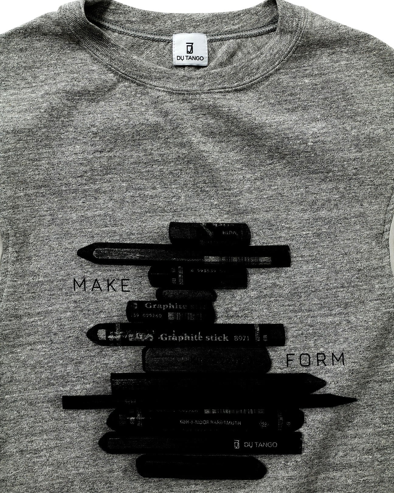 もちもちした柔らかさとストレッチ性を併せ持つロボスニットをボディにメモリータフタを袖に使用したグラフィカルTEE。深いアーム下のカバーとして、薄天竺の脇あても付けました。クロッキーデッサン用のペンをモチーフにしたプリントはコレクションテーマであるアーティストにフォーカスしたデザイン。