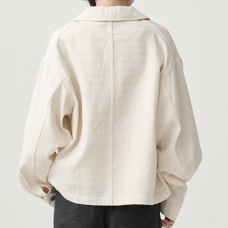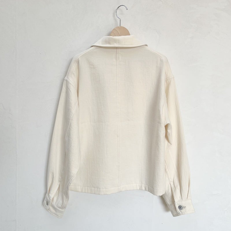 大きめの衿が程よいアクセントになり、ドロップショルダーとゆとりのあるサイズ感でリラックス感のあるシルエットに仕上げています。
