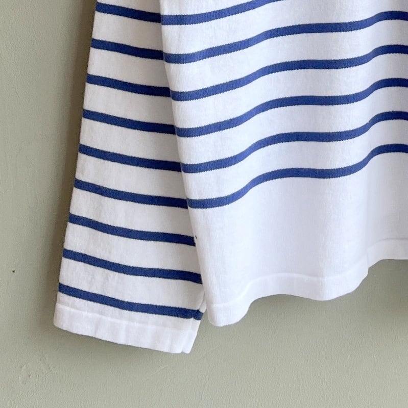 襟や前立てには、コットンローンの布帛素材を組み合わせることで、さりげない立体感と上品さをプラス。シンプルなボーダーに奥行きを生み、大人のカジュアルスタイルにちょうどいい一枚に仕上がっています。