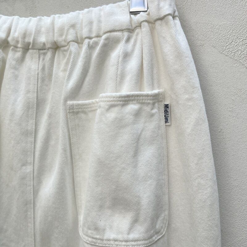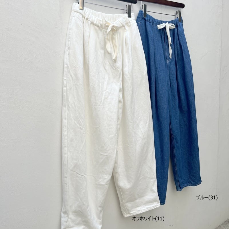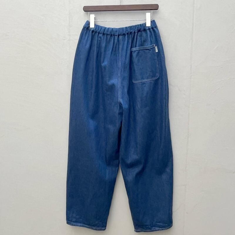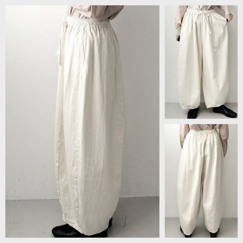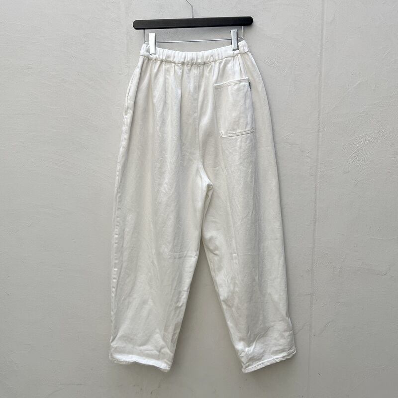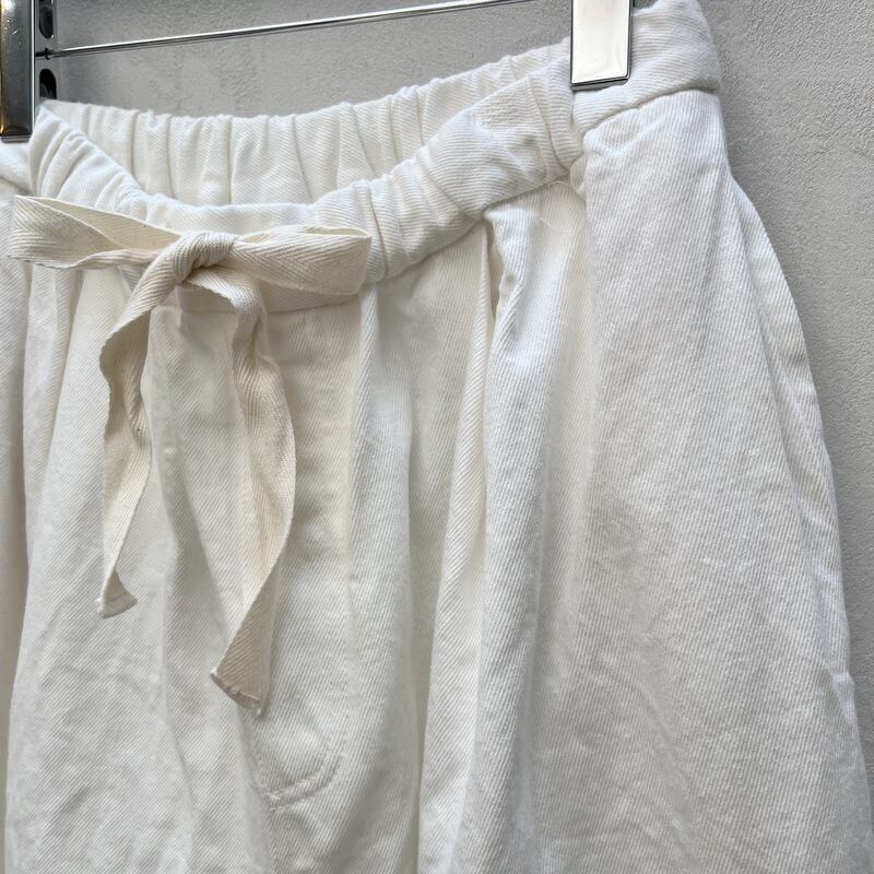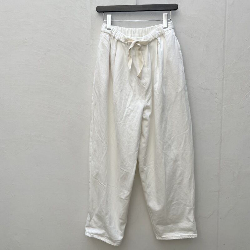 ウエストはゴム使用に加え調整紐付きで、股上は深めにとっているためゆとりのあるサイズ感が特徴。パンツ裾は細めに仕上げたシルエットを表現。