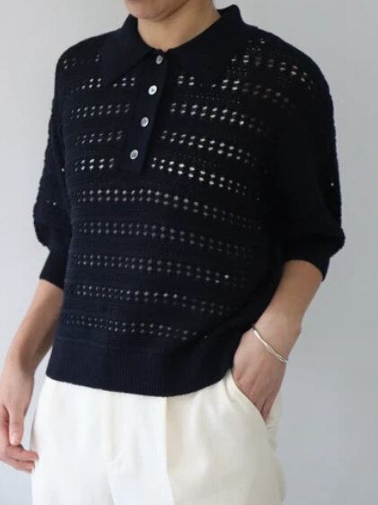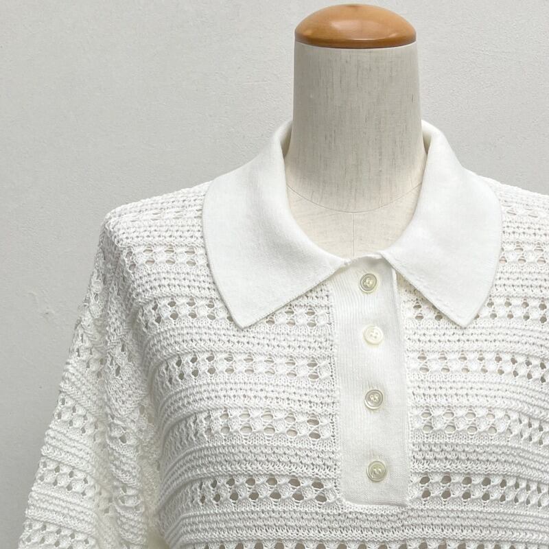 レース調の透かし編みとパフスリーブで襟付きながらフェミニンなイメージに。