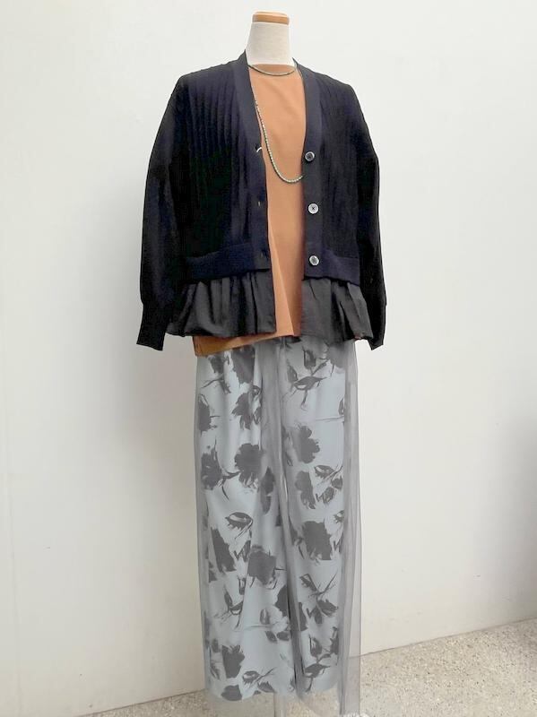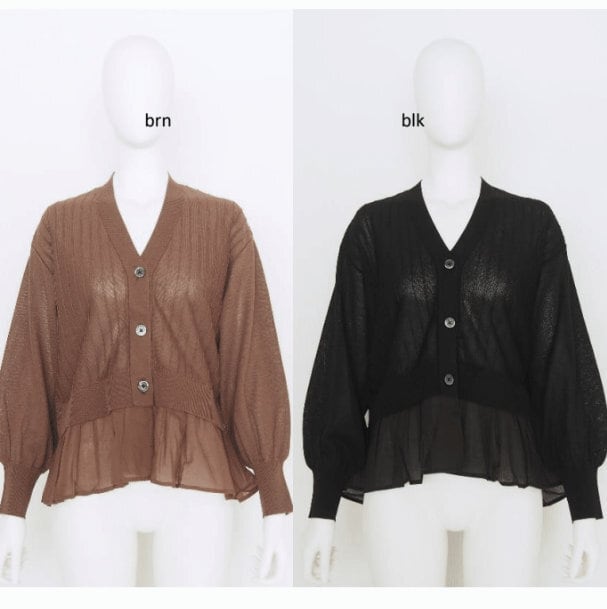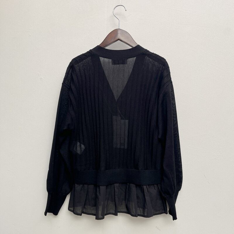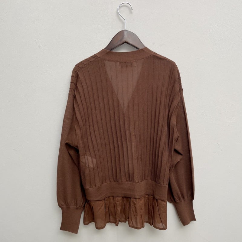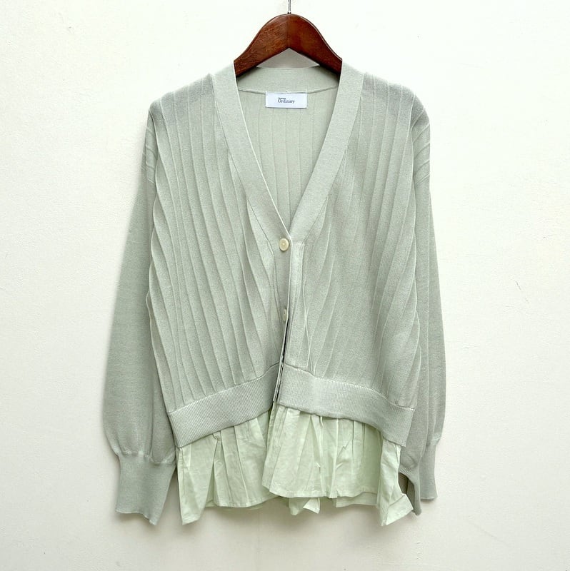 裾を布帛とドッキングし、レイヤードしているように見せたニットカーディガンです。フロン トはすっきりとしたVネックで、シルエットはゆるっとしたリラックス感のあるフォルムに仕 上げました。ニットの柔らかさに布帛の軽やかな表情が加わり、さりげなくデザイン性を引き 立てる1着。シアーな素材感で、真夏の冷房対策にもおすすめです。